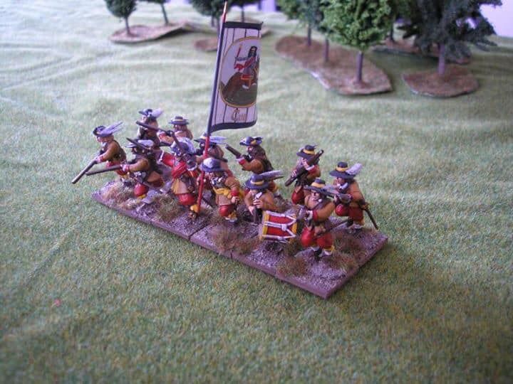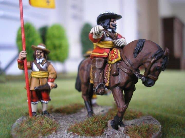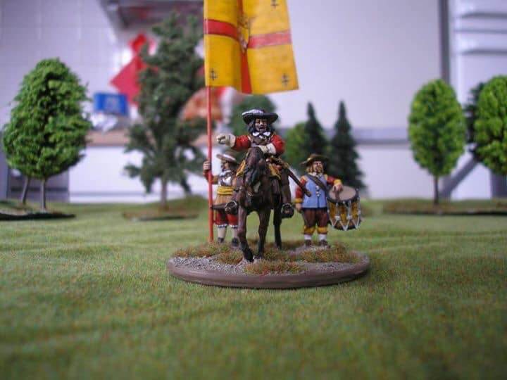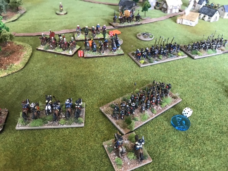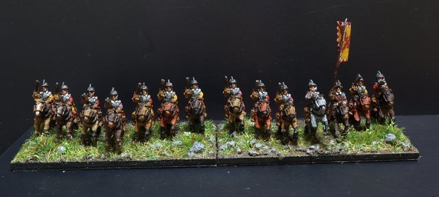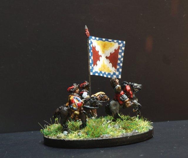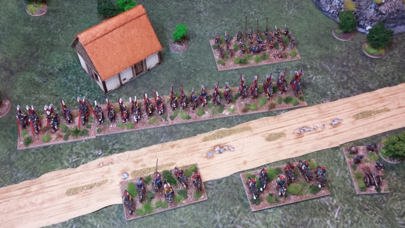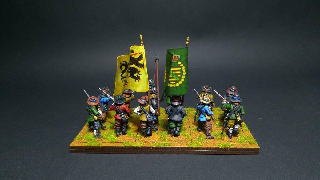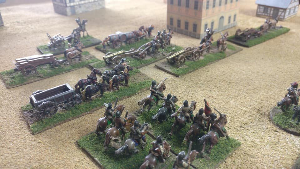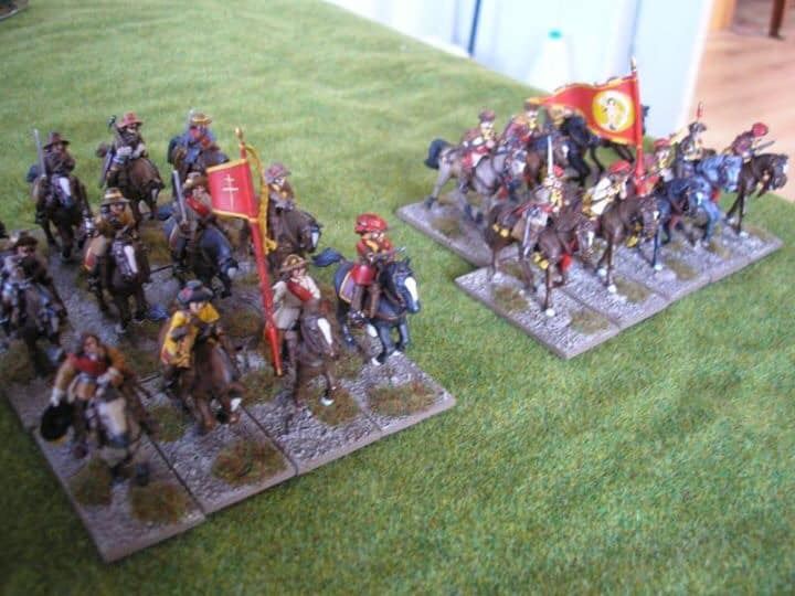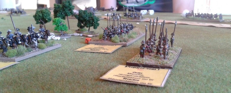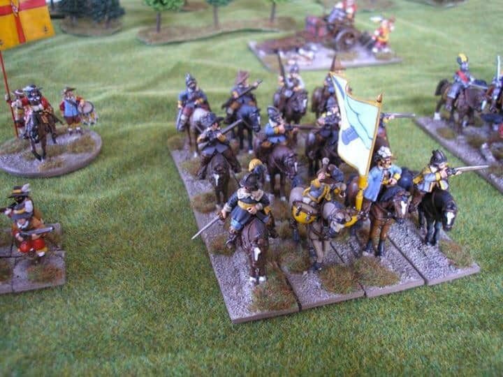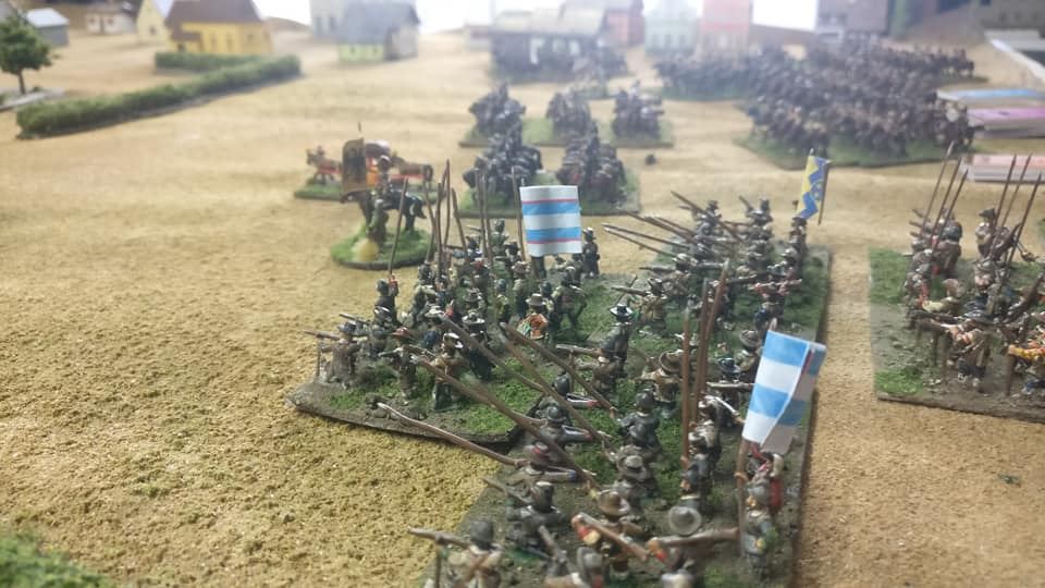 3ème ligne : un escadron d’arquebusiers à cheval de Goschütz et un escadron d’arquebusiers à cheval de Westrumb encadrant un petit bataillon d’infanterie (compagnies de mousquetaires).