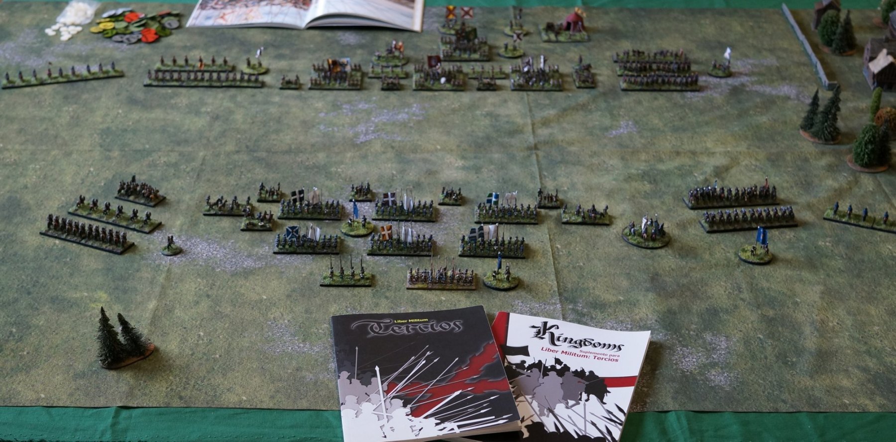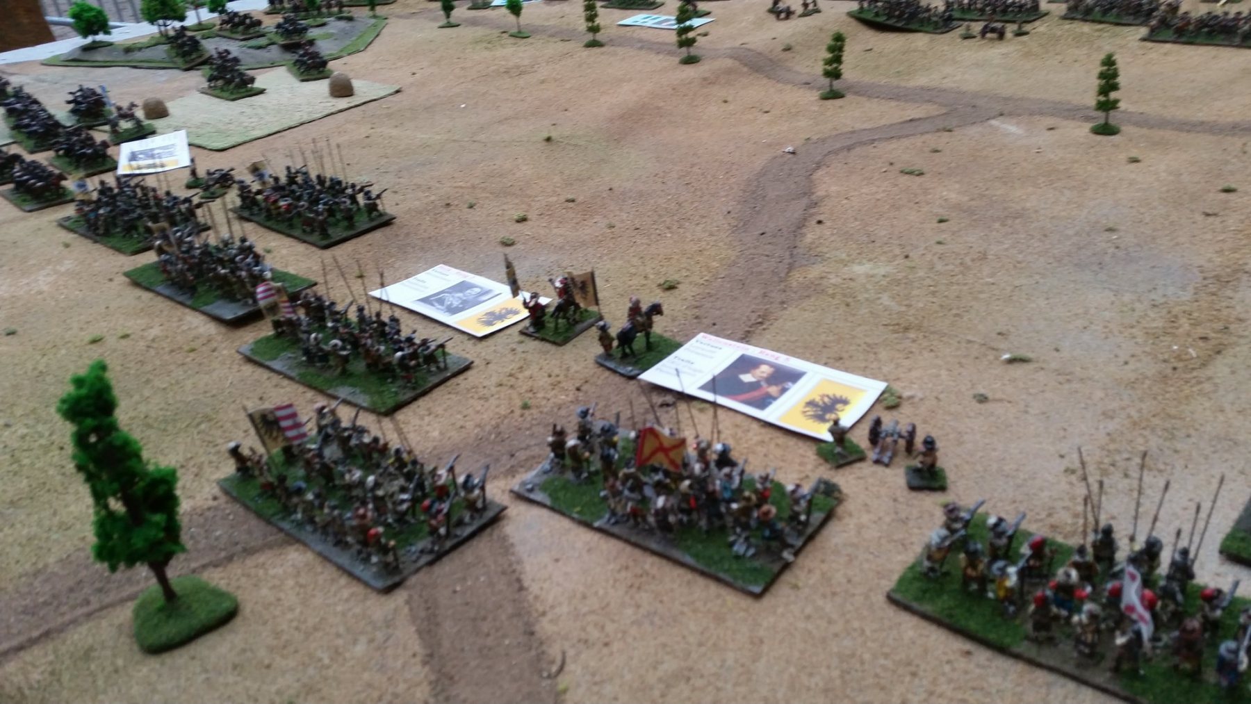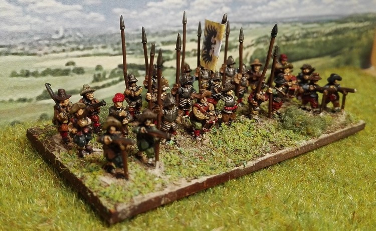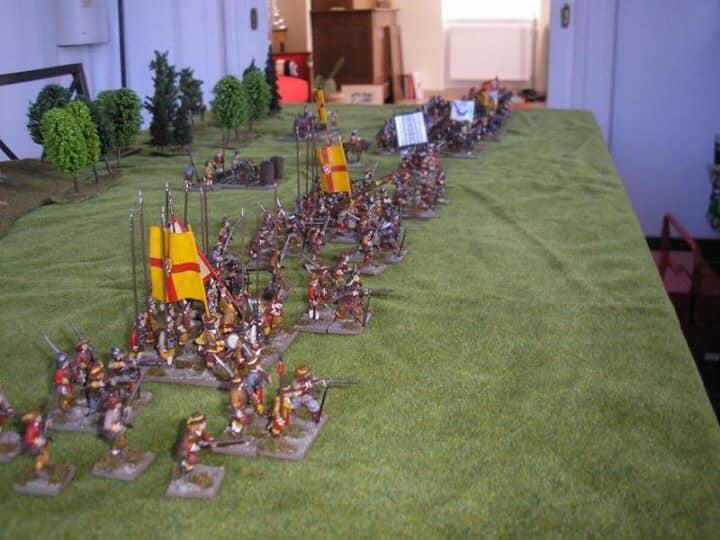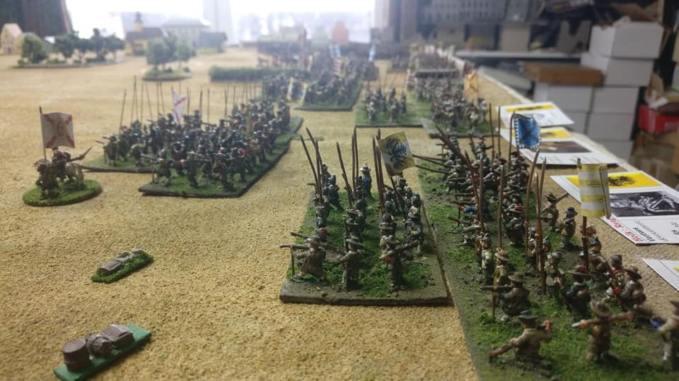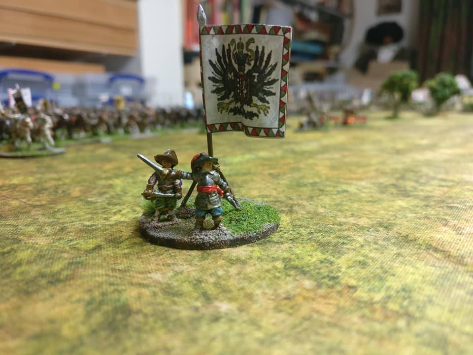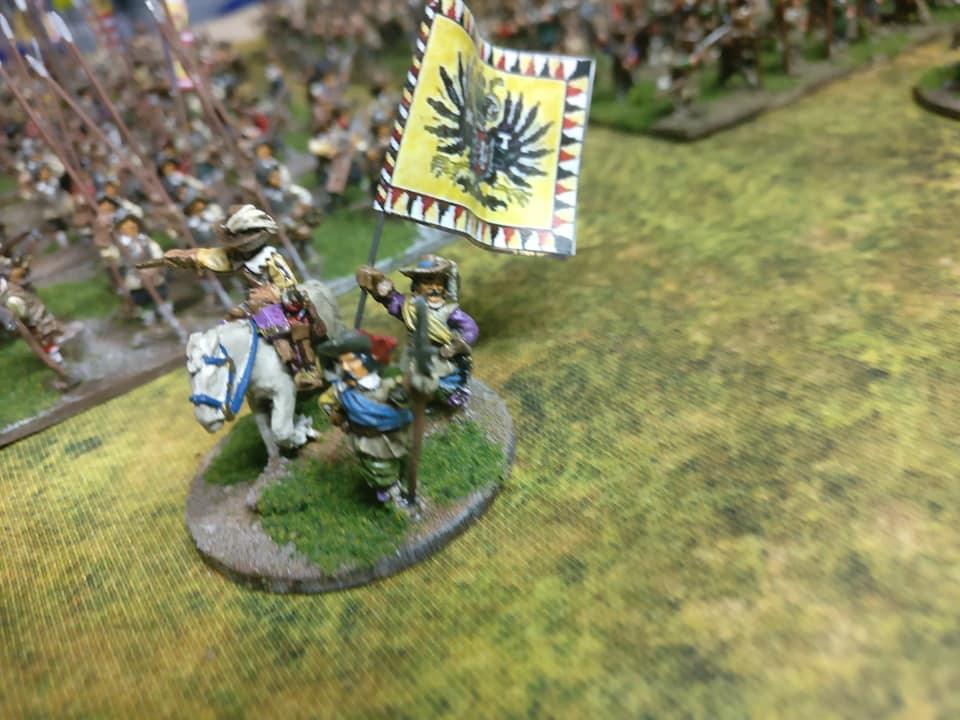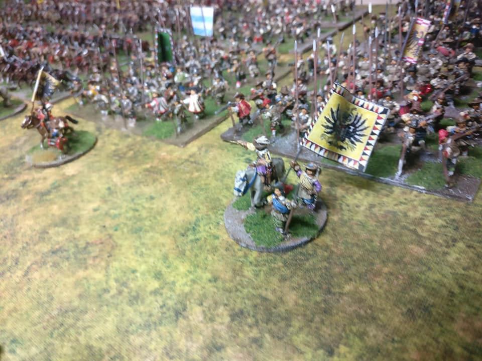 Pour LM Tercios : les bataillons d’infanterie impériaux sont à 1000 hommes, sauf celui de troisième ligne qui est à 500 hommes, auxquels s’ajoutent et 17 escadrons de cavalerie à 310 chevaux chacun. Les 7 bataillons d’infanterie des deux premières lignes sont classic squadron modernised musket only. Le bataillon de dernière ligne, constitué de compagnies de mousquetaires, est shot company musketeers. De plus, deux des bataillons de première ligne ont un regimental gun. Les 2 autres compagnies de mousquetaires (une sur chaque aile sont shot company musketeers). La compagnie de l’aile droite inclue les quelques dragons de Trcka (100h). Les 6 escadrons de cuirassiers sont cuirassiers large formation, les 7 escadrons d’arquebusiers à cheval sont mounted arquebusiers large formation avec pistol, les 4 escadrons de croates sont light horse. L’artillerie se décompose en 2 canons lourds et 2 canon moyens.