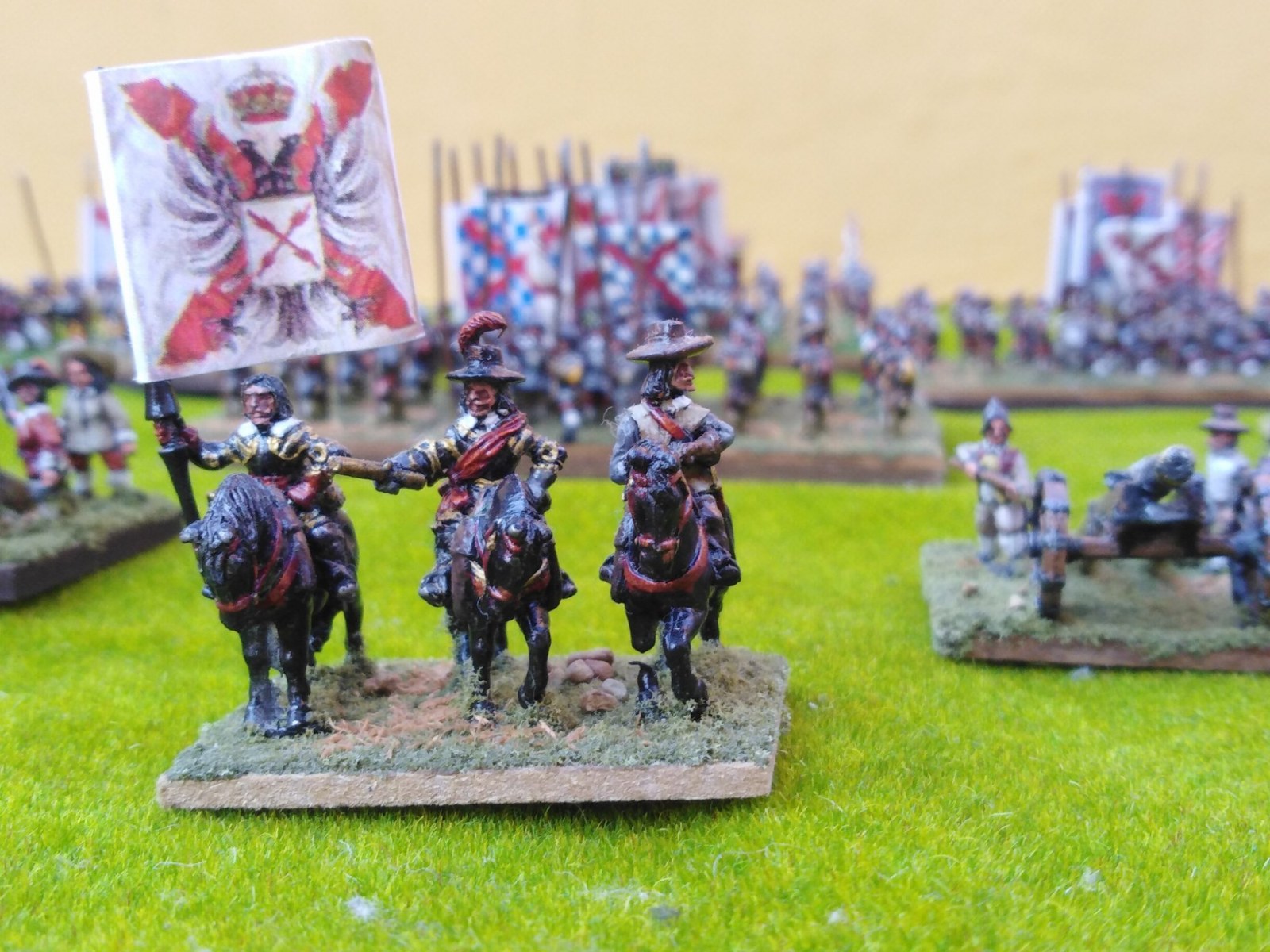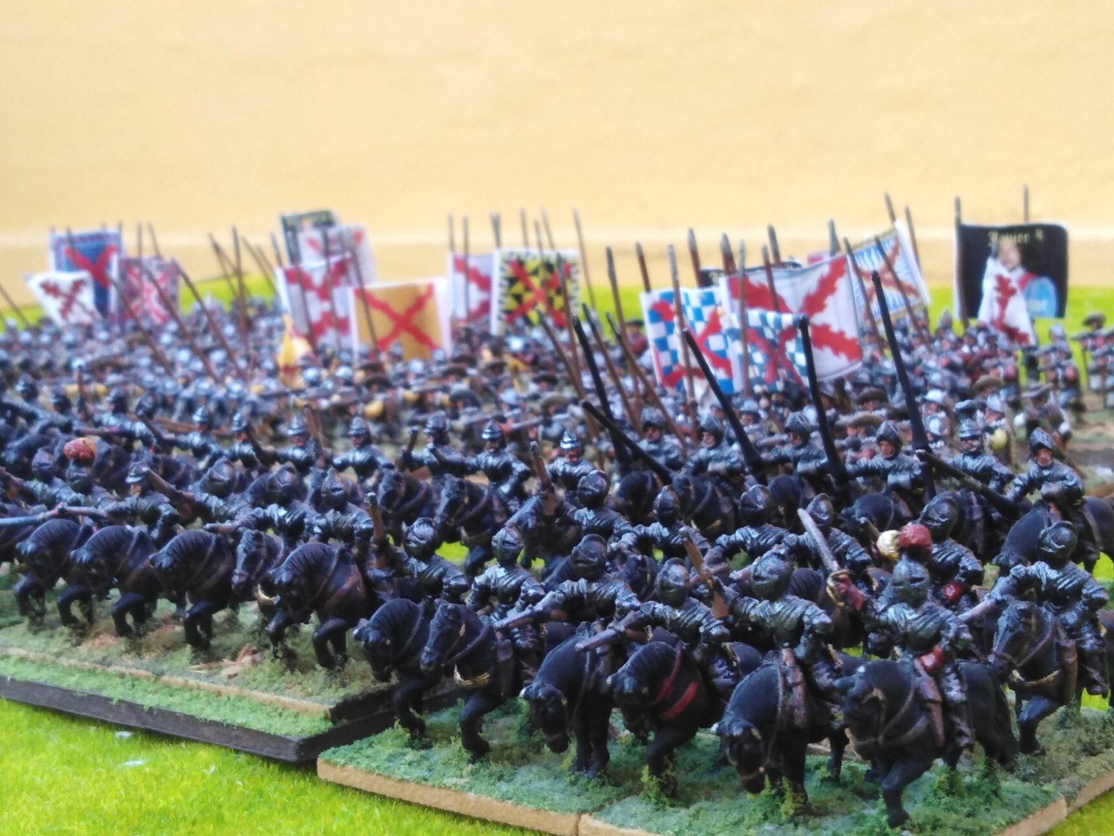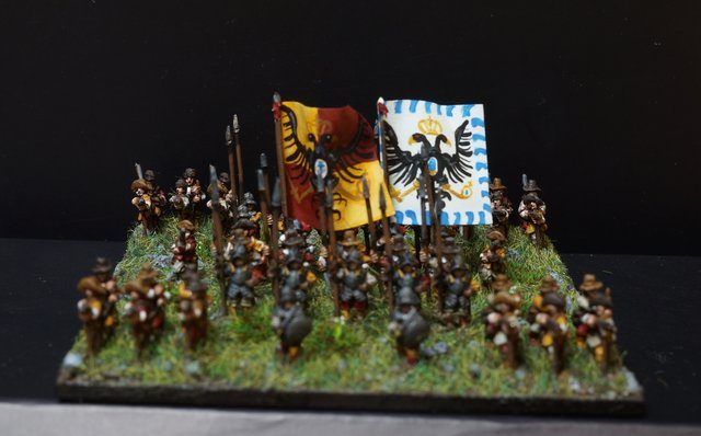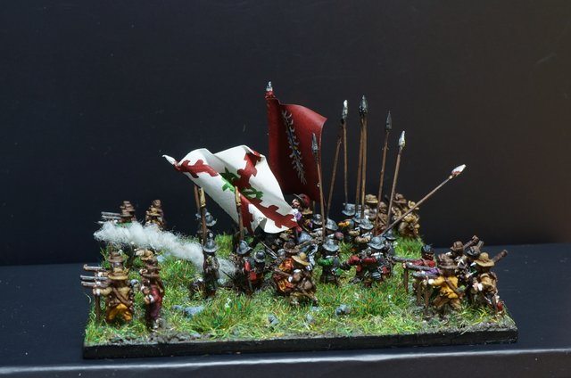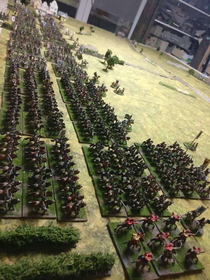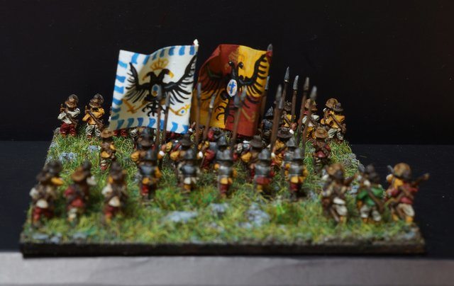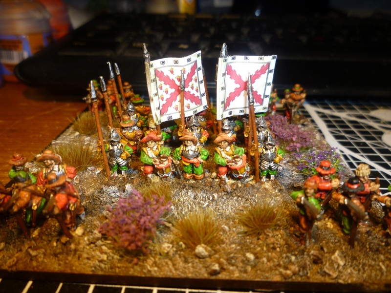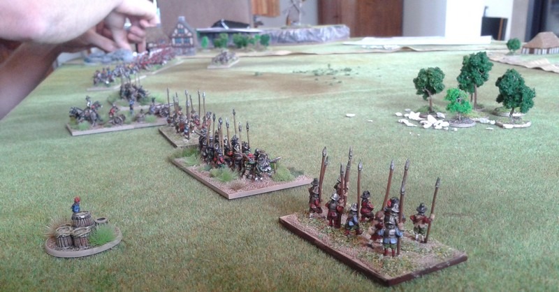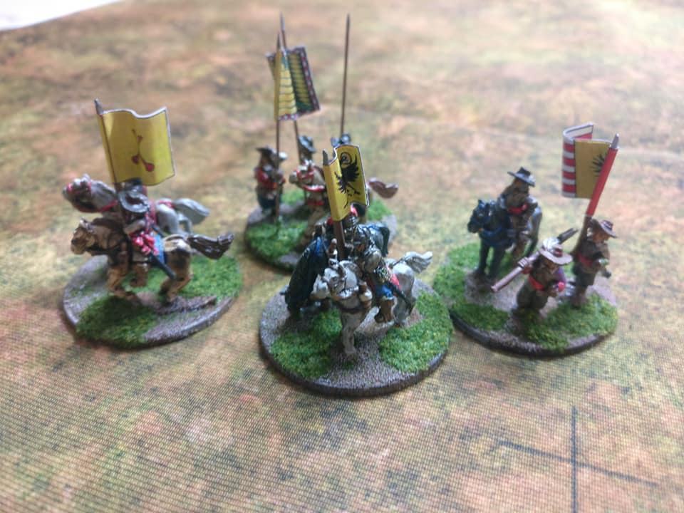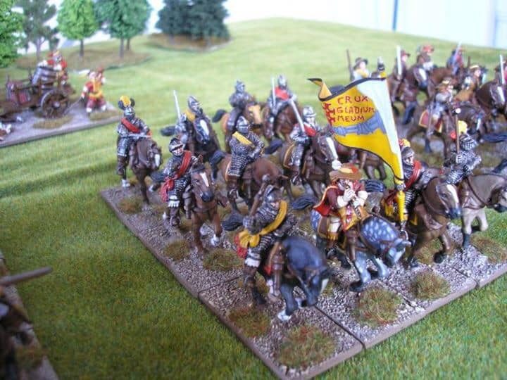 Pour LM Tercios : les bataillons d’infanterie impériaux sont à 1000 hommes, sauf celui de troisième ligne qui est à 500 hommes, auxquels s’ajoutent et 17 escadrons de cavalerie à 310 chevaux chacun. Les 7 bataillons d’infanterie des deux premières lignes sont classic squadron modernised musket only. Le bataillon de dernière ligne, constitué de compagnies de mousquetaires, est shot company musketeers. De plus, deux des bataillons de première ligne ont un regimental gun. Les 2 autres compagnies de mousquetaires (une sur chaque aile sont shot company musketeers). La compagnie de l’aile droite inclue les quelques dragons de Trcka (100h). Les 6 escadrons de cuirassiers sont cuirassiers large formation, les 7 escadrons d’arquebusiers à cheval sont mounted arquebusiers large formation avec pistol, les 4 escadrons de croates sont light horse. L’artillerie se décompose en 2 canons lourds et 2 canon moyens.