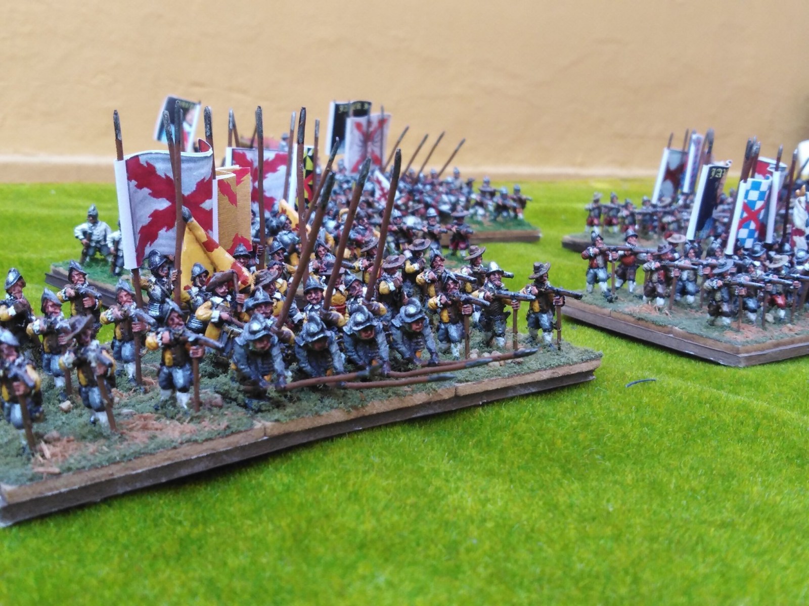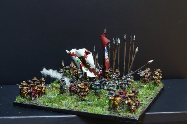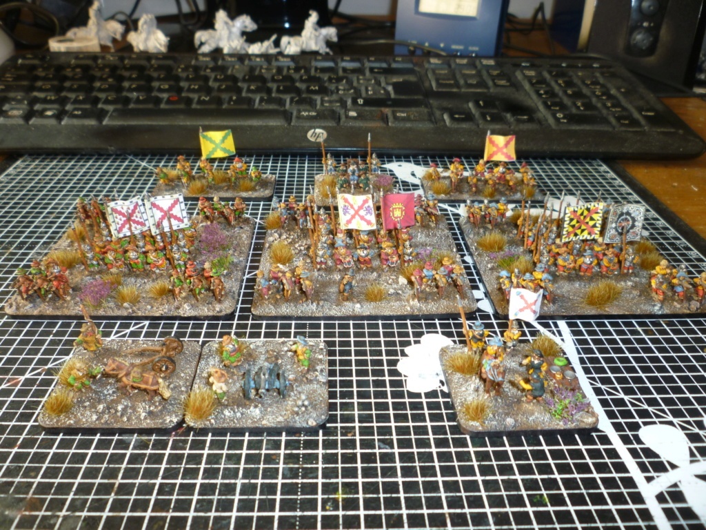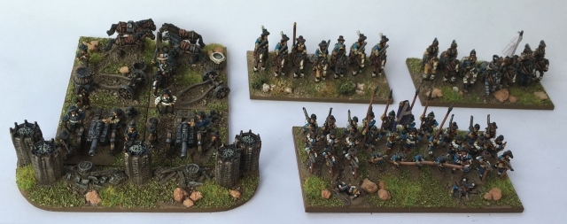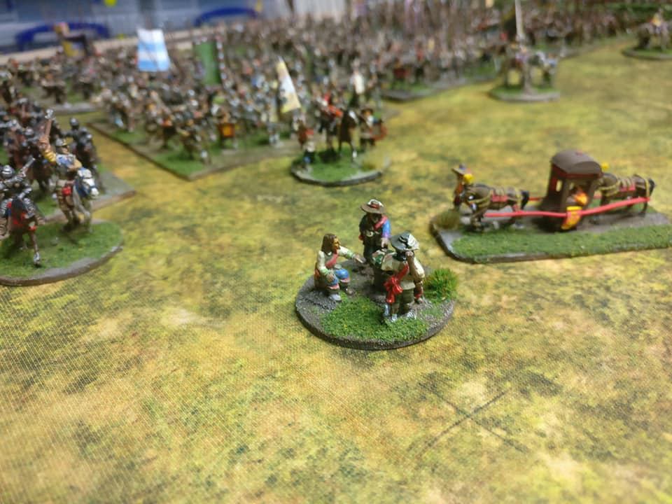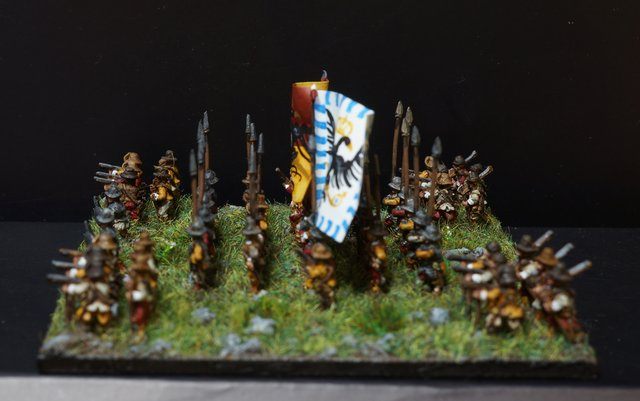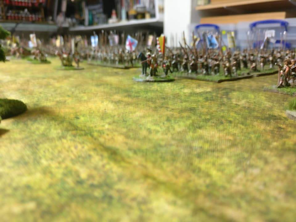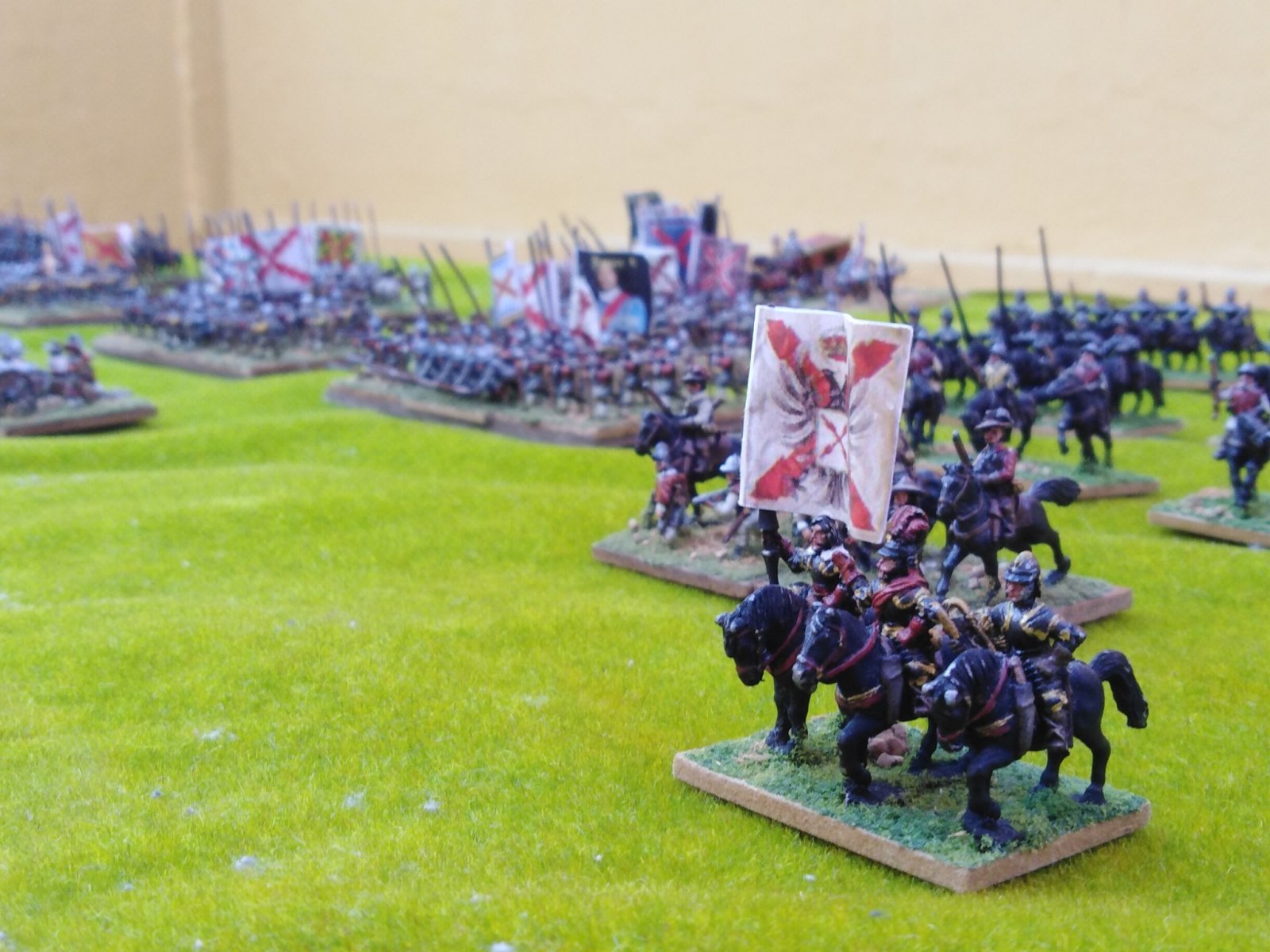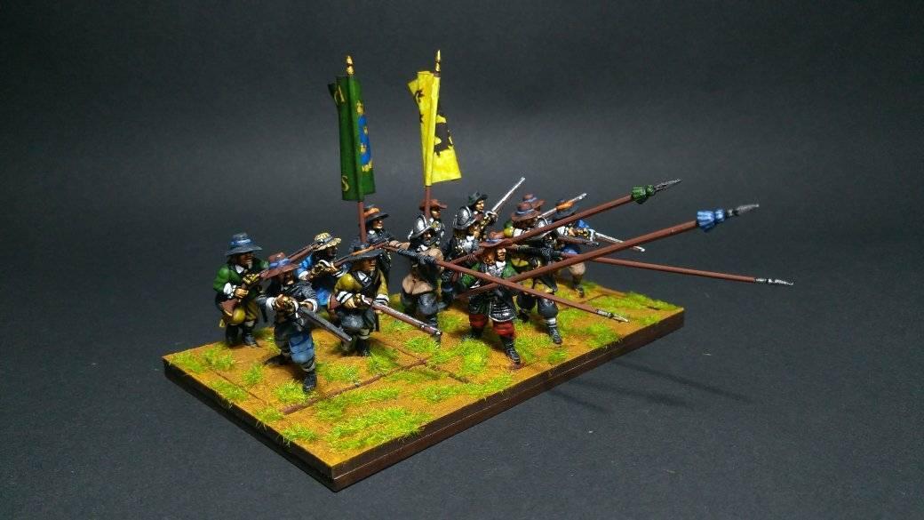 Pour LM Tercios : les bataillons d’infanterie impériaux sont à 1000 hommes, sauf celui de troisième ligne qui est à 500 hommes, auxquels s’ajoutent et 17 escadrons de cavalerie à 310 chevaux chacun. Les 7 bataillons d’infanterie des deux premières lignes sont classic squadron modernised musket only. Le bataillon de dernière ligne, constitué de compagnies de mousquetaires, est shot company musketeers. De plus, deux des bataillons de première ligne ont un regimental gun. Les 2 autres compagnies de mousquetaires (une sur chaque aile sont shot company musketeers). La compagnie de l’aile droite inclue les quelques dragons de Trcka (100h). Les 6 escadrons de cuirassiers sont cuirassiers large formation, les 7 escadrons d’arquebusiers à cheval sont mounted arquebusiers large formation avec pistol, les 4 escadrons de croates sont light horse. L’artillerie se décompose en 2 canons lourds et 2 canon moyens.