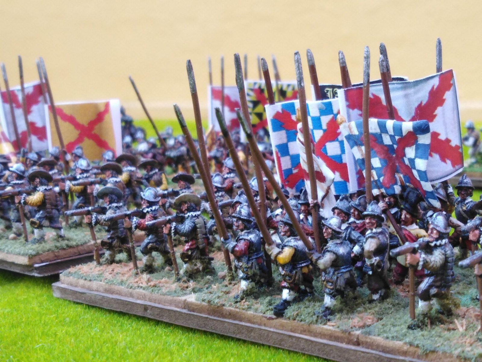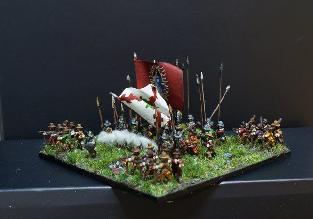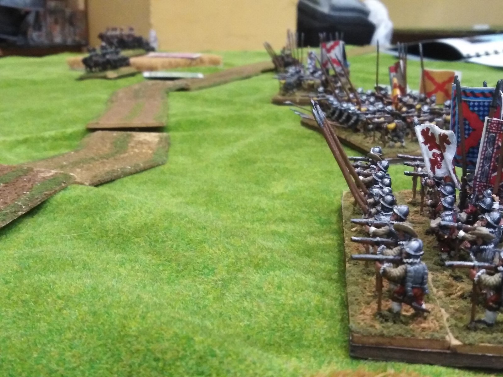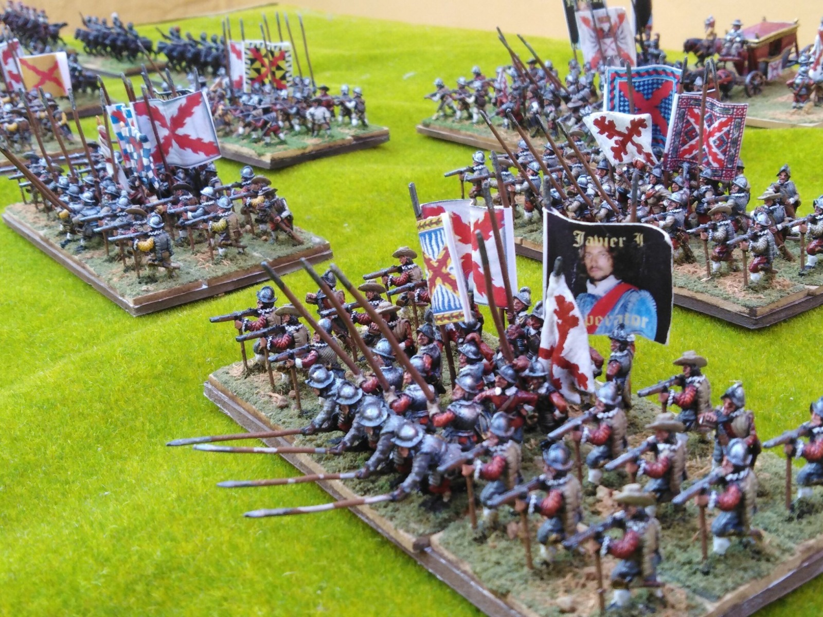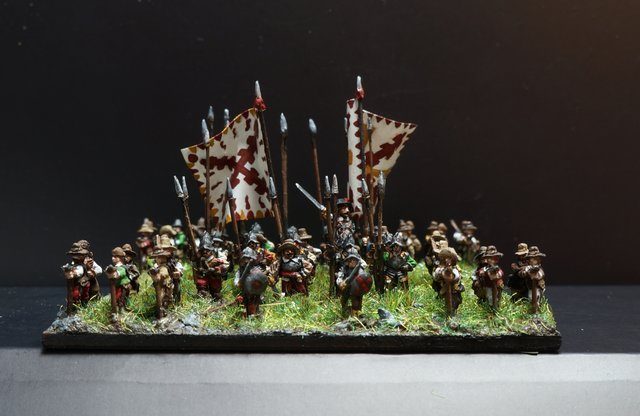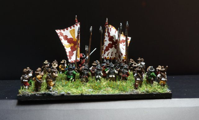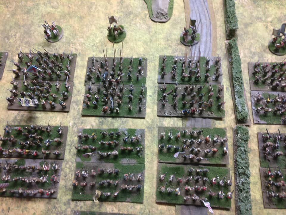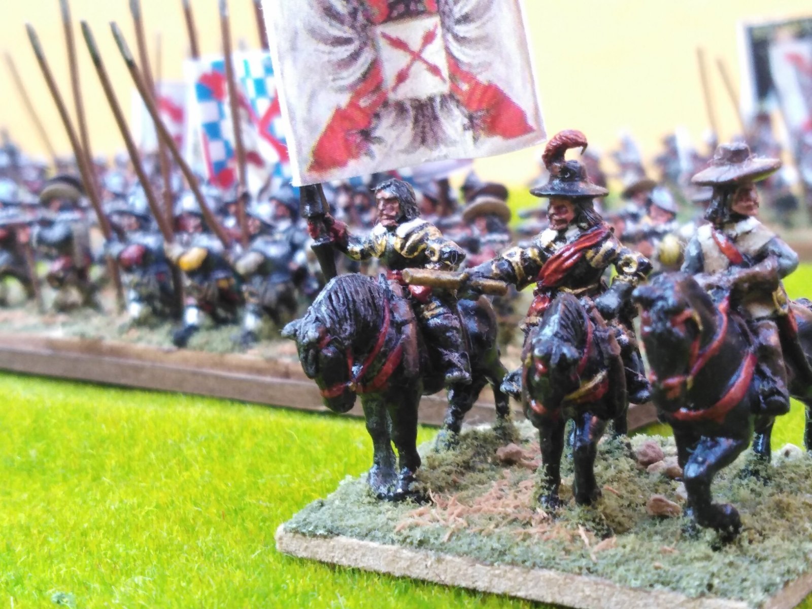 Pour LM Tercios : les bataillons d’infanterie impériaux sont à 1000 hommes, sauf celui de troisième ligne qui est à 500 hommes, auxquels s’ajoutent et 17 escadrons de cavalerie à 310 chevaux chacun. Les 7 bataillons d’infanterie des deux premières lignes sont classic squadron modernised musket only. Le bataillon de dernière ligne, constitué de compagnies de mousquetaires, est shot company musketeers. De plus, deux des bataillons de première ligne ont un regimental gun. Les 2 autres compagnies de mousquetaires (une sur chaque aile sont shot company musketeers). La compagnie de l’aile droite inclue les quelques dragons de Trcka (100h). Les 6 escadrons de cuirassiers sont cuirassiers large formation, les 7 escadrons d’arquebusiers à cheval sont mounted arquebusiers large formation avec pistol, les 4 escadrons de croates sont light horse. L’artillerie se décompose en 2 canons lourds et 2 canon moyens.