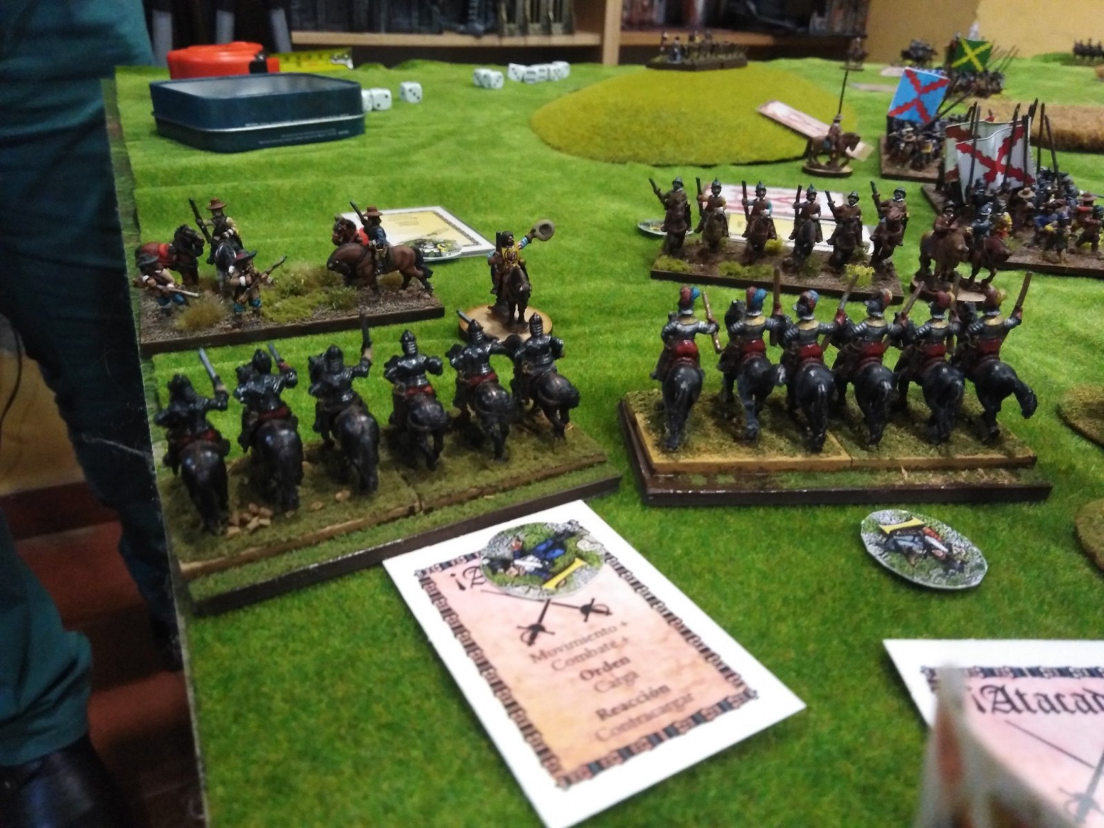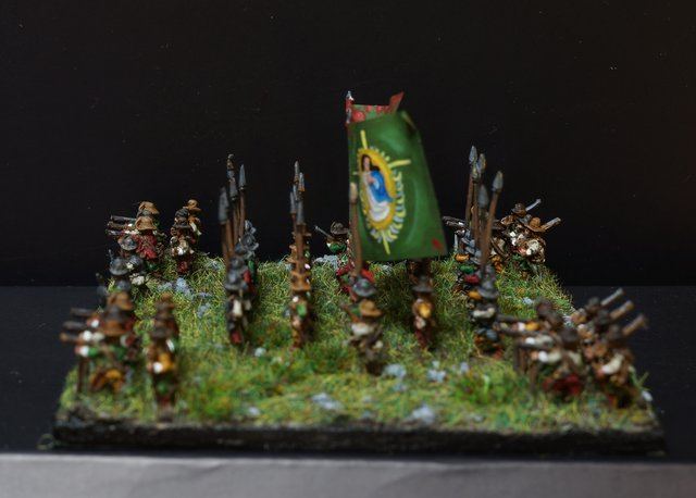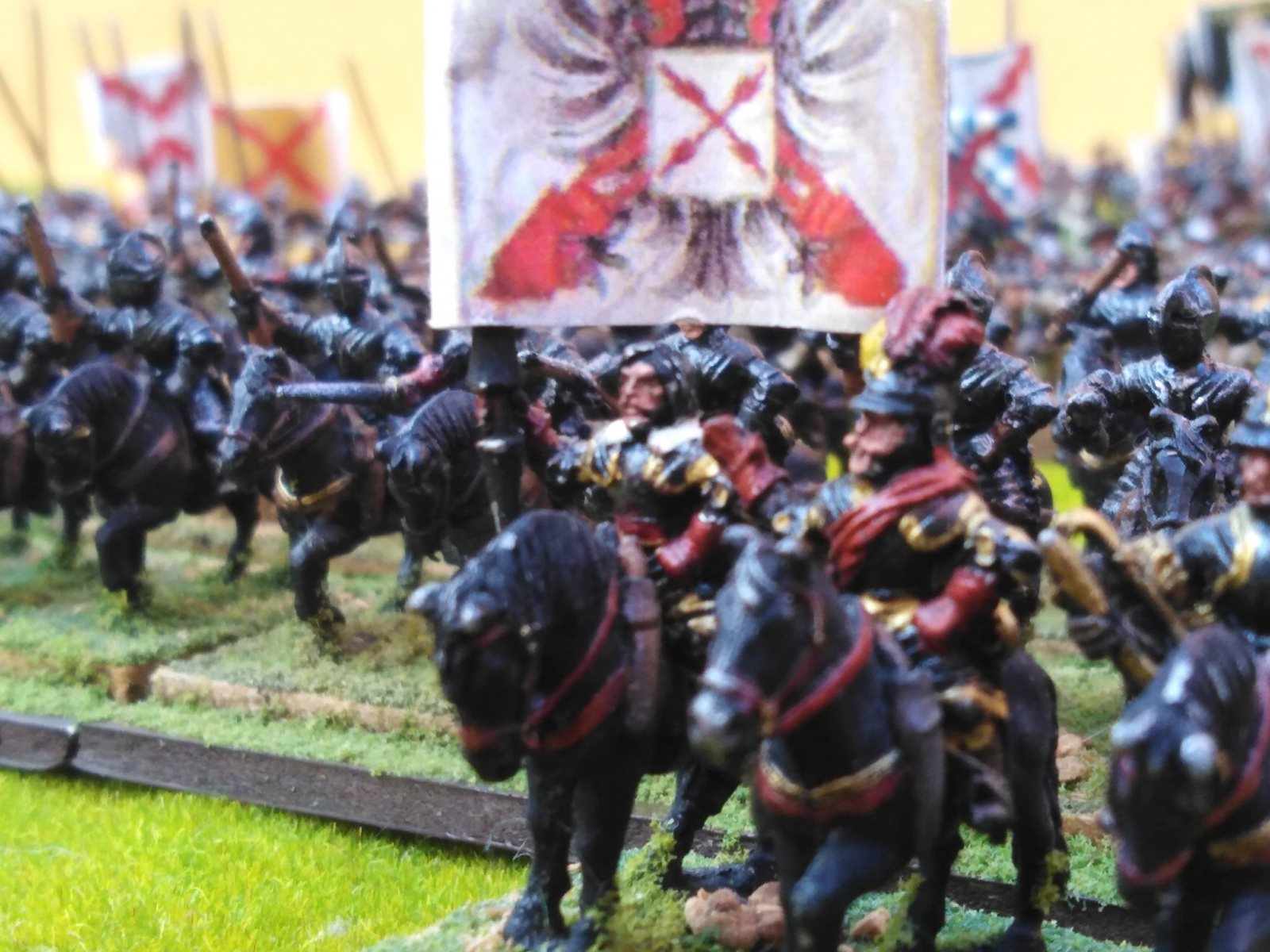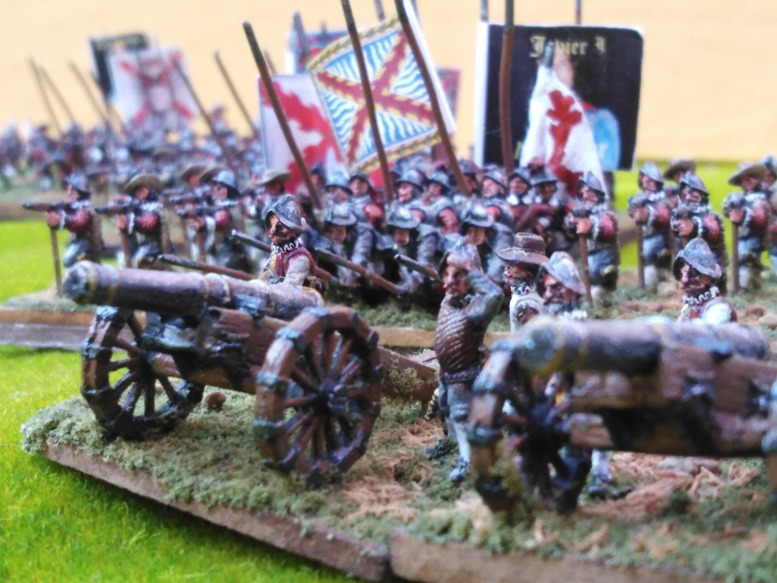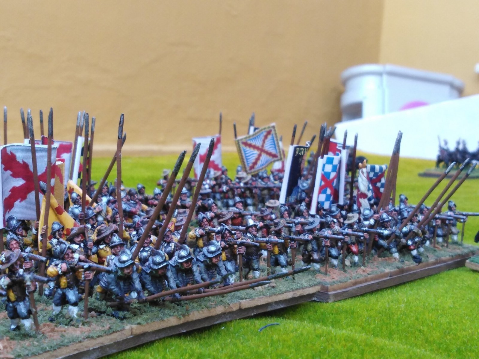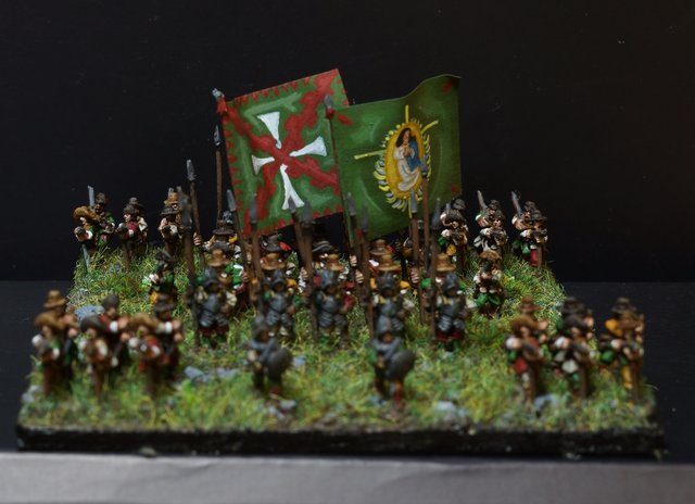 Pour LM Tercios : les bataillons d’infanterie impériaux sont à 1000 hommes, sauf celui de troisième ligne qui est à 500 hommes, auxquels s’ajoutent et 17 escadrons de cavalerie à 310 chevaux chacun. Les 7 bataillons d’infanterie des deux premières lignes sont classic squadron modernised musket only. Le bataillon de dernière ligne, constitué de compagnies de mousquetaires, est shot company musketeers. De plus, deux des bataillons de première ligne ont un regimental gun. Les 2 autres compagnies de mousquetaires (une sur chaque aile sont shot company musketeers). La compagnie de l’aile droite inclue les quelques dragons de Trcka (100h). Les 6 escadrons de cuirassiers sont cuirassiers large formation, les 7 escadrons d’arquebusiers à cheval sont mounted arquebusiers large formation avec pistol, les 4 escadrons de croates sont light horse. L’artillerie se décompose en 2 canons lourds et 2 canon moyens.