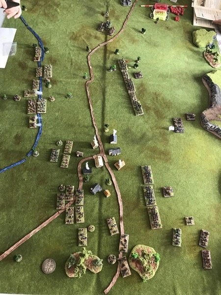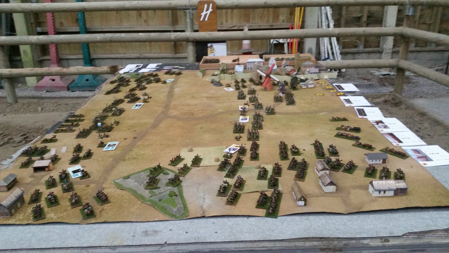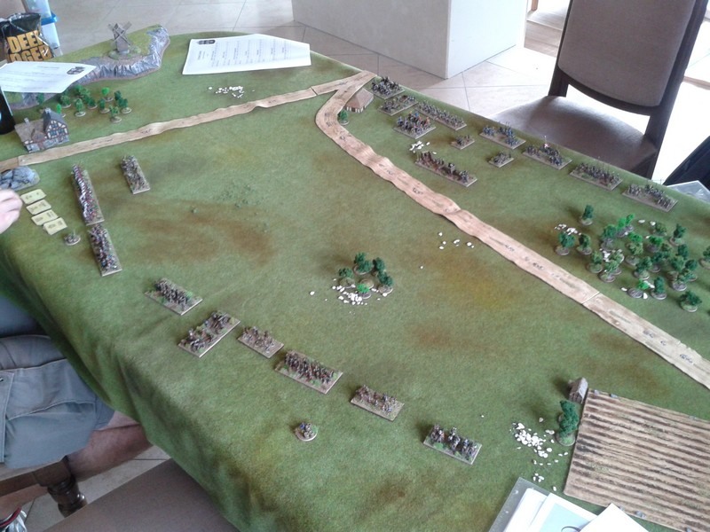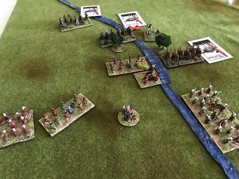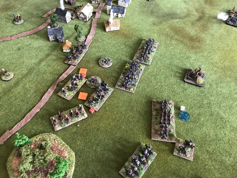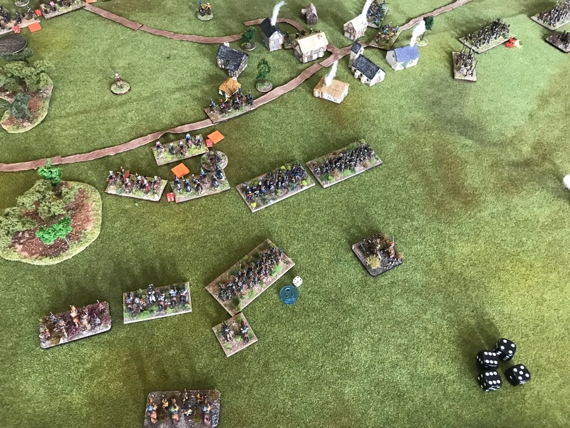 Deuxième ligne (de droite à gauche) : Brigade duc Wilhelm/Bose (1726), brigade Knyphausen blanche (1120), brigade Thurn (1832), brigade Mitzlaff (1834). En réserve, derrière : Ohm CR (300).