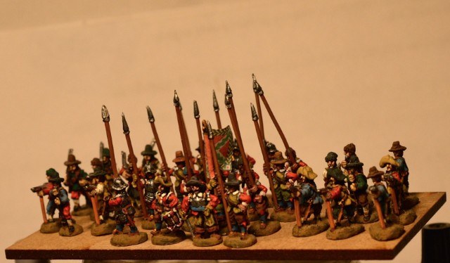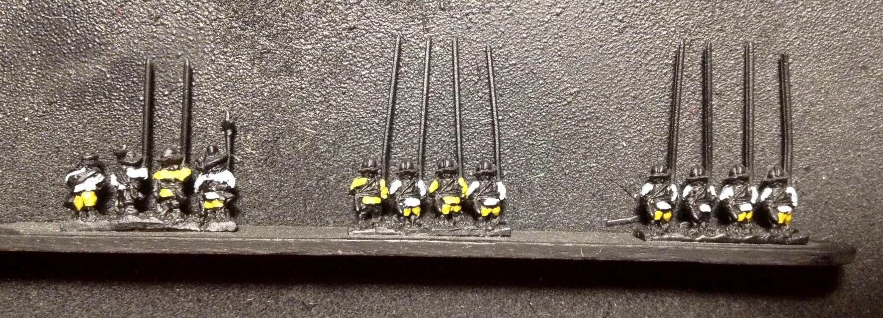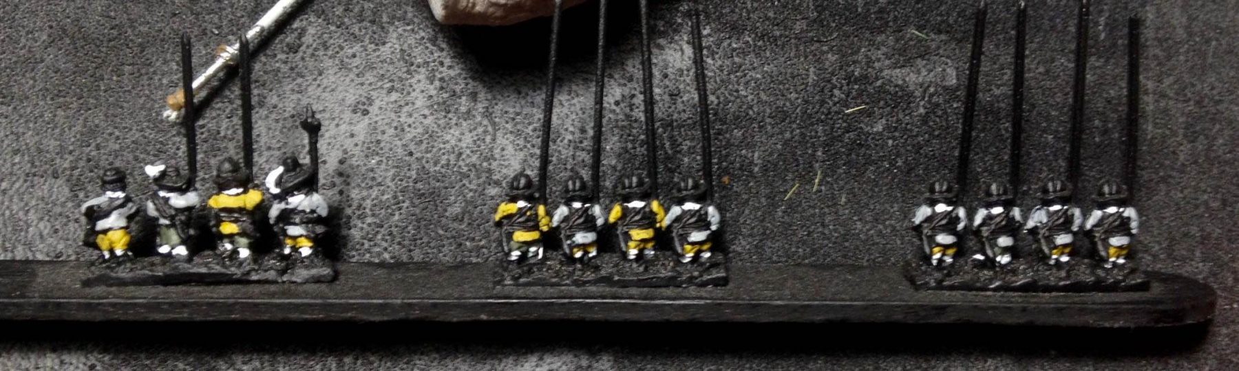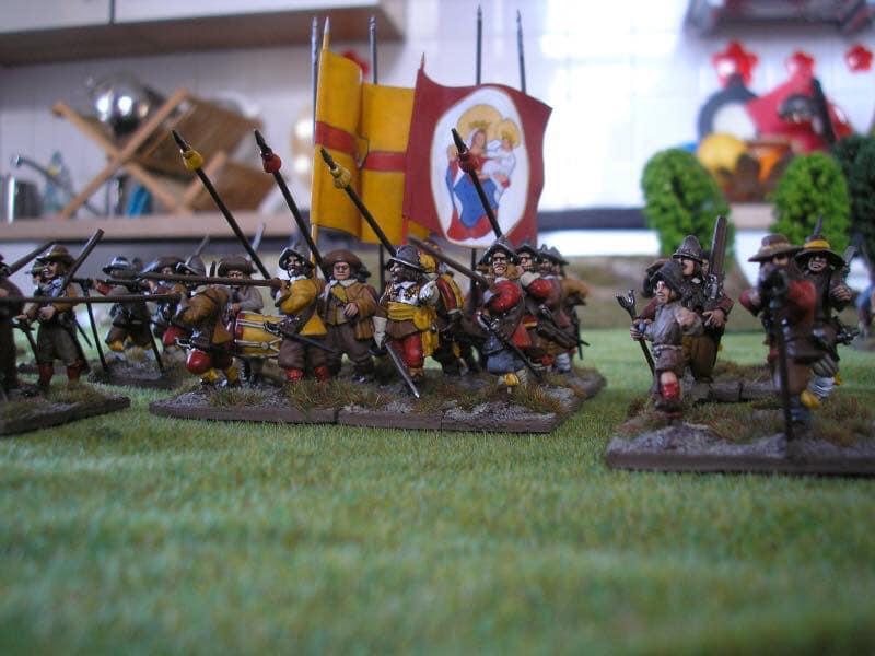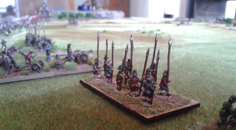 Venaient ensuite 4 gros bataillons d’infanterie allemande et suédoise, assez espacés entre eux : c’étaient les deux brigades noire et jaune, en 28 enseignes, auxquels étaient joints les brigades bleue et verte formées de 18 compagnies des régiments de Winckel et Relingen et de celui de Bernard de Weimar en 26 enseignes.