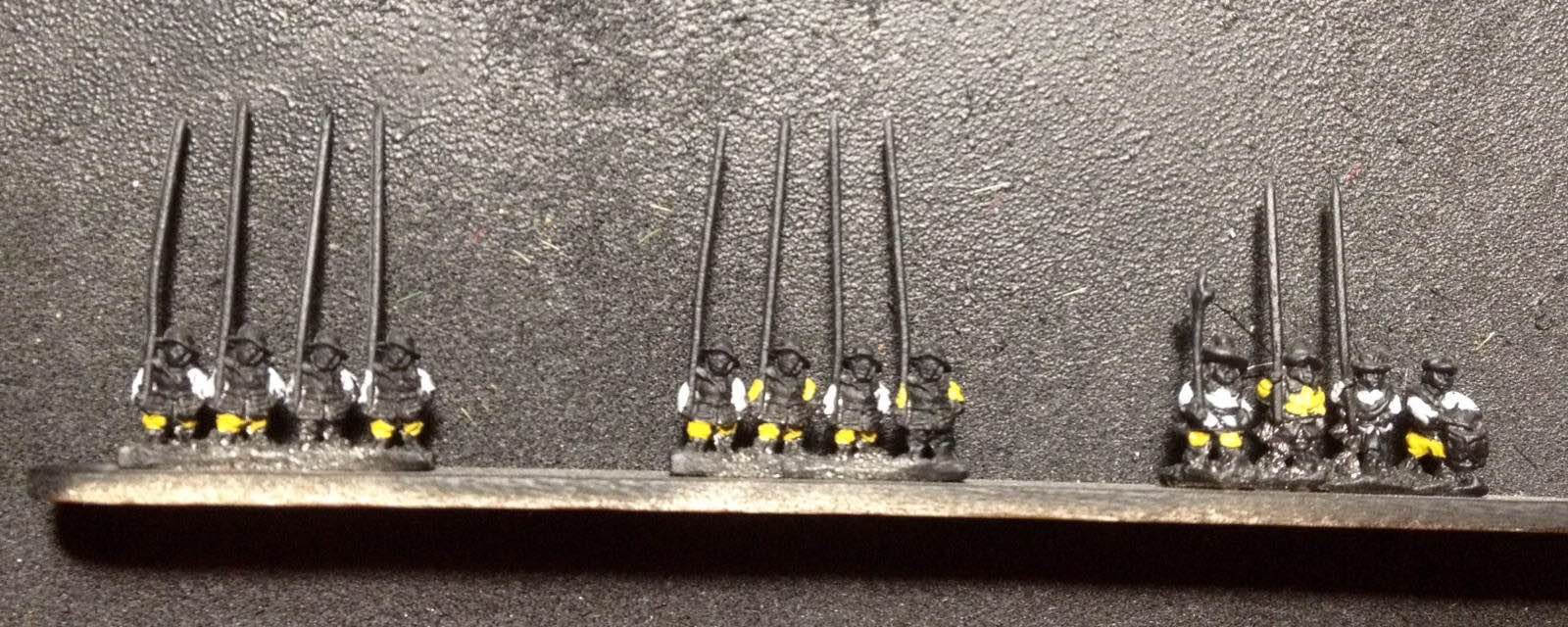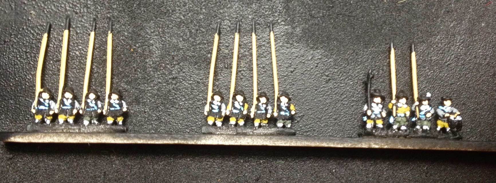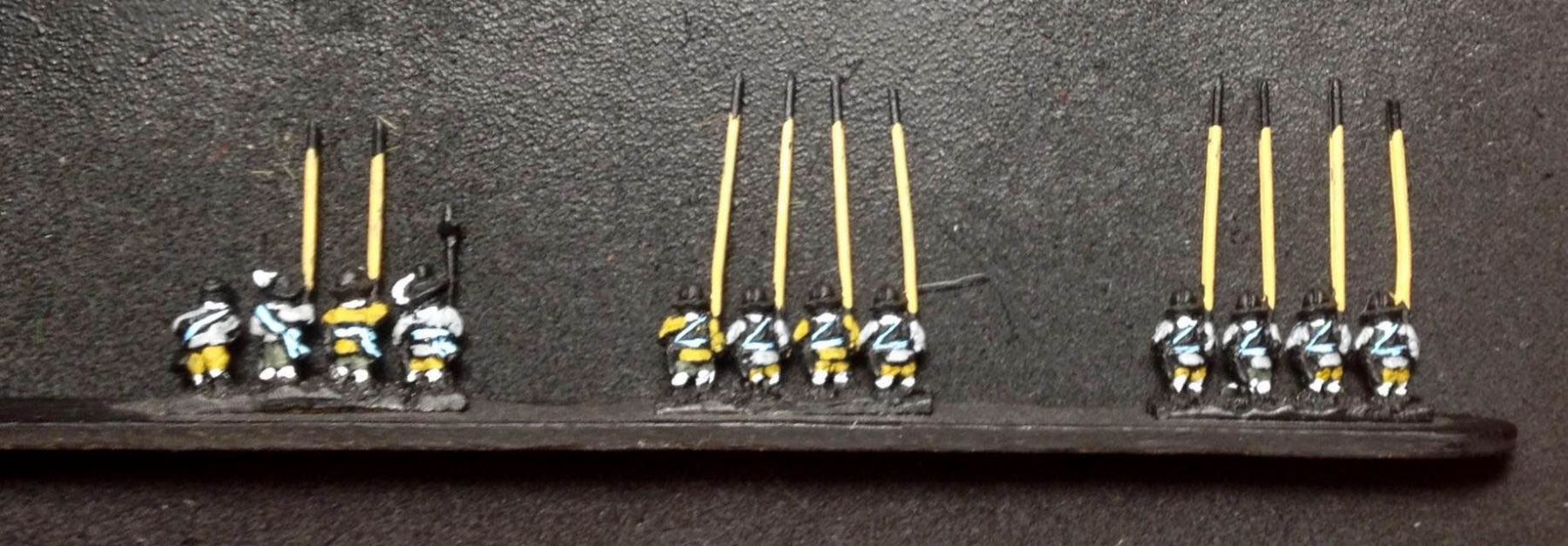 Venaient ensuite 4 gros bataillons d’infanterie allemande et suédoise, assez espacés entre eux : c’étaient les deux brigades noire et jaune, en 28 enseignes, auxquels étaient joints les brigades bleue et verte formées de 18 compagnies des régiments de Winckel et Relingen et de celui de Bernard de Weimar en 26 enseignes.