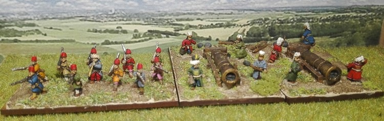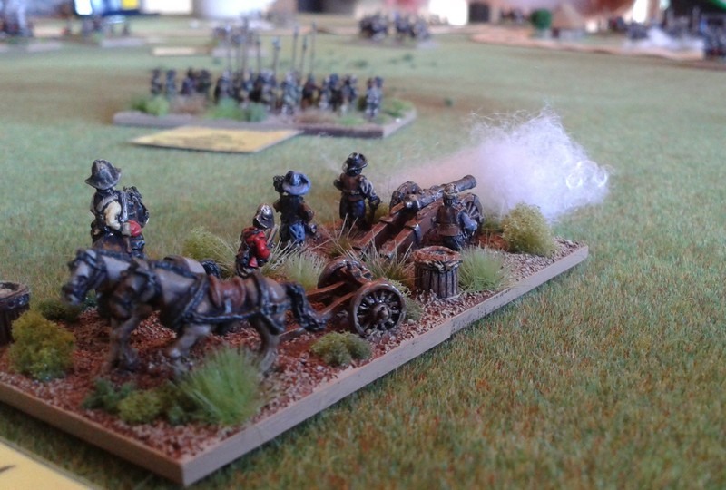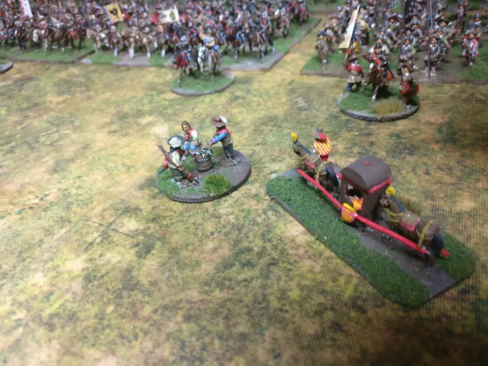 Première ligne : 6 escadrons de cavalerie mêlés à 5 détachements de mousquetaires avec 19 canons.