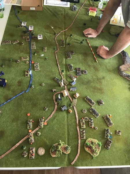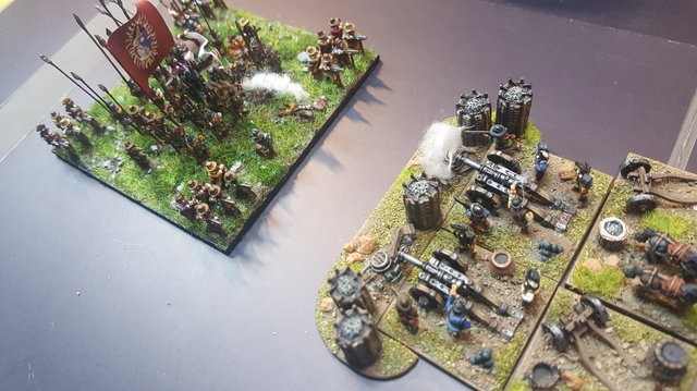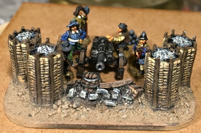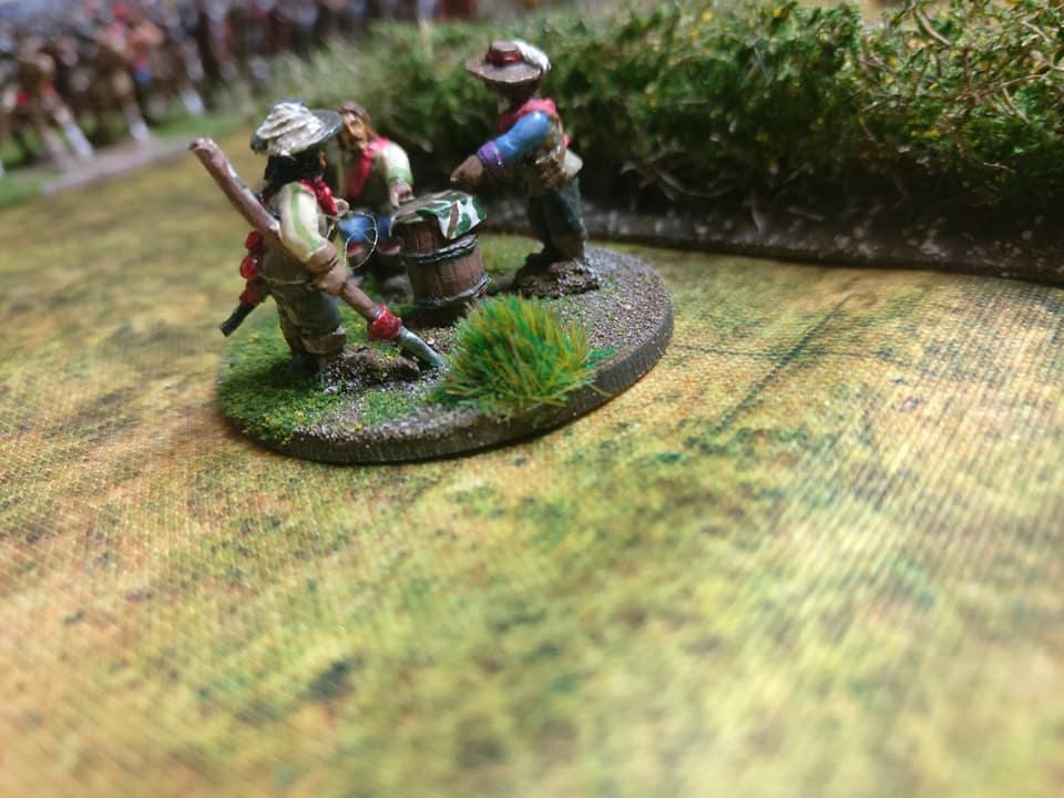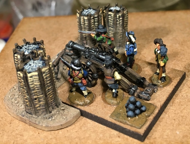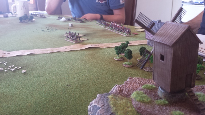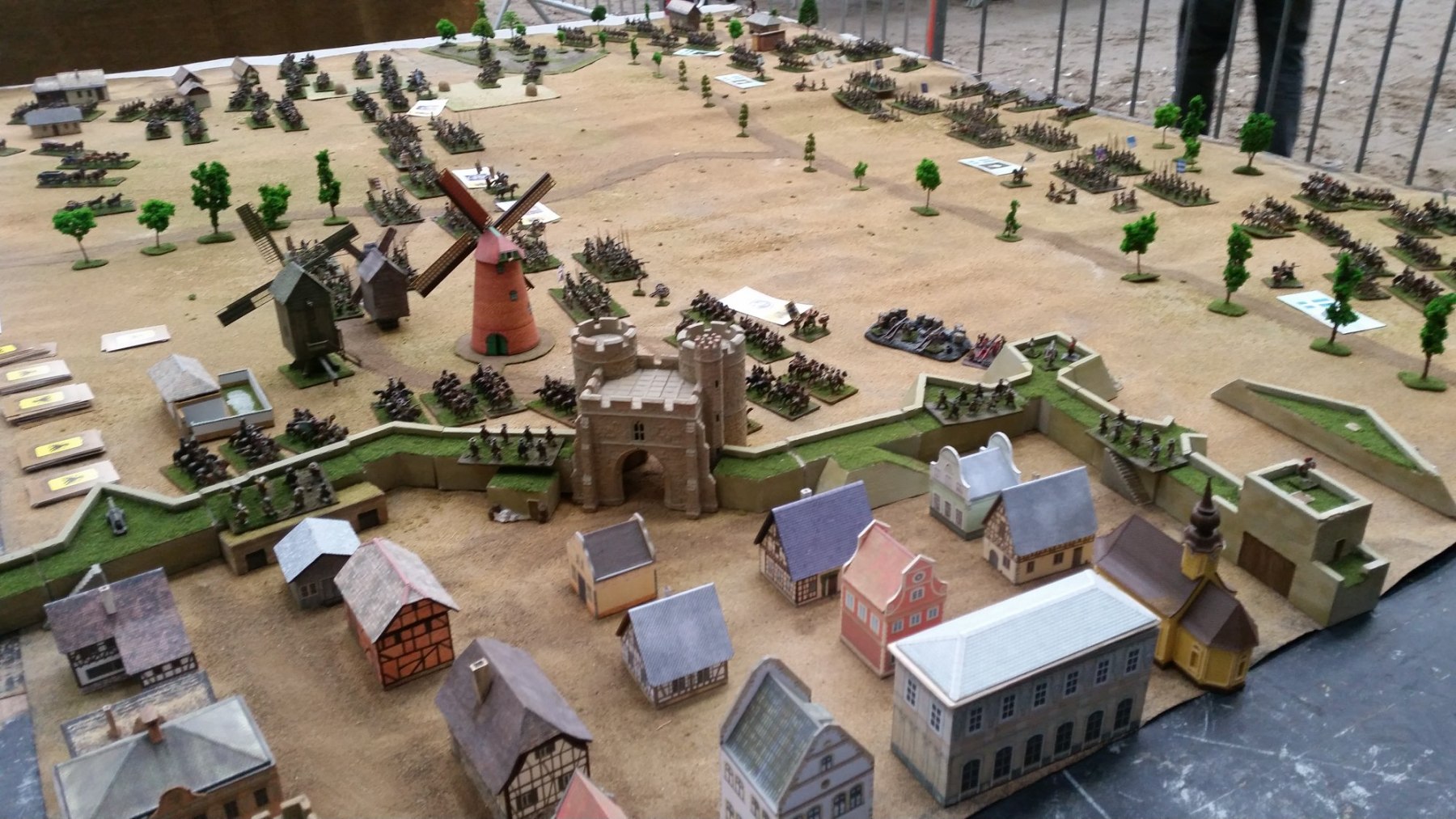 Les impériaux sont protégés par un fossé : ce fossé est very difficult. De plus, les deux compagnies de mousquetaires (et uniquement elles) placées sur les ailes et derrière ce fossé sont considérées protected. La compagnie de mousquetaires placée à l’aile droite (dans Lützen et la maison du meunier au pied des 3 moulins) est en plus covered. Les bataillons d’infanterie et les escadrons de cavalerie, placés derrière, sont plus éloignés du fossé et ne profitent donc pas de ces couvertures.