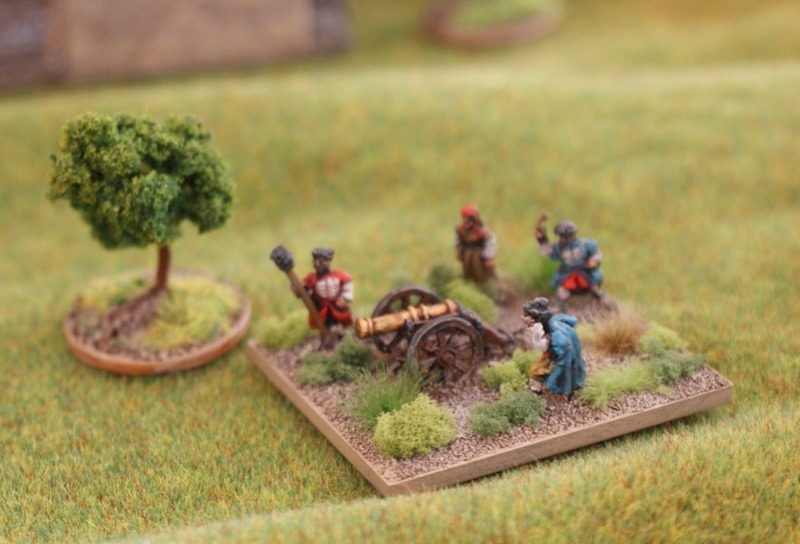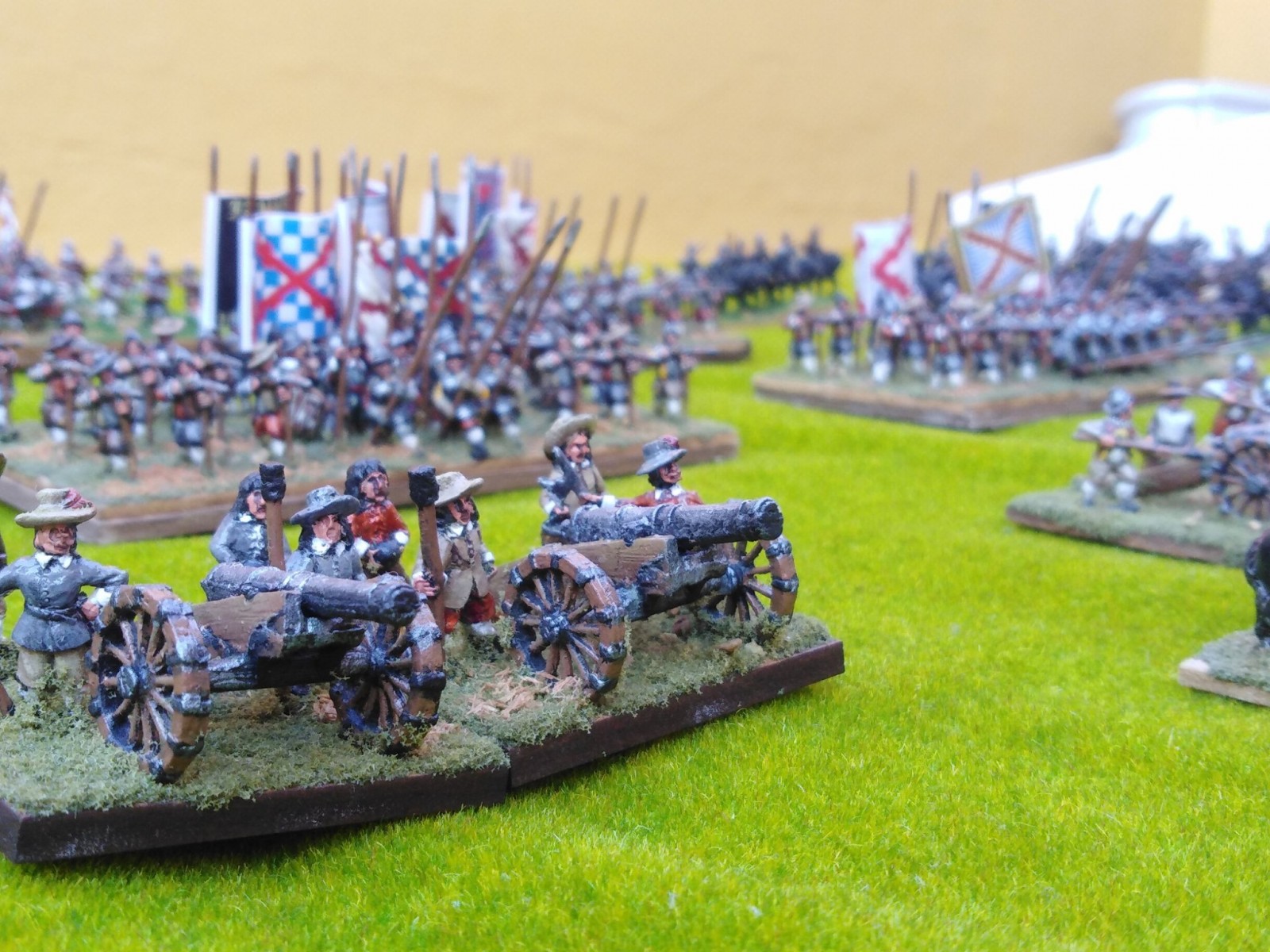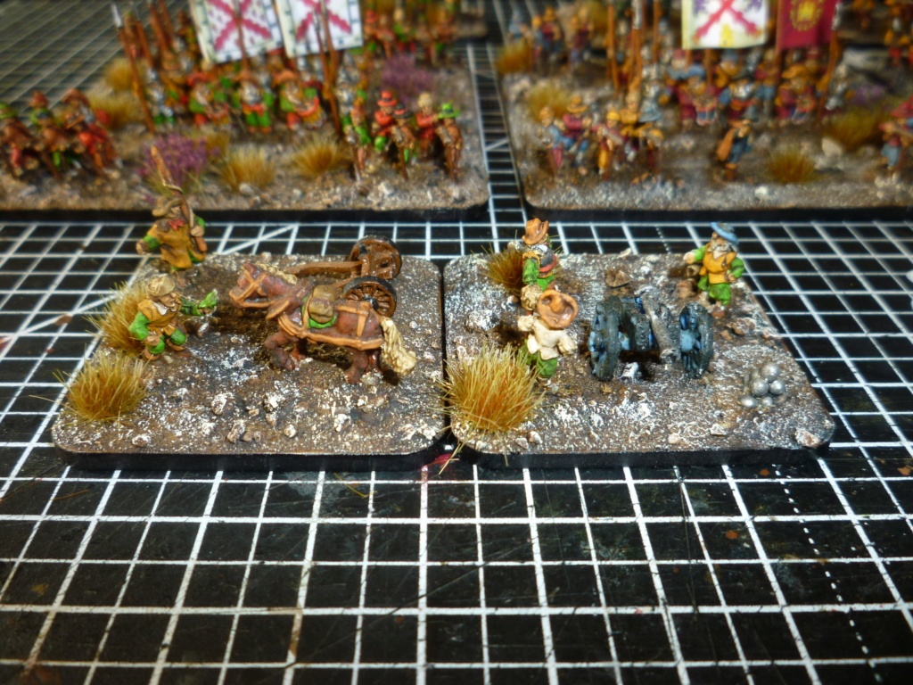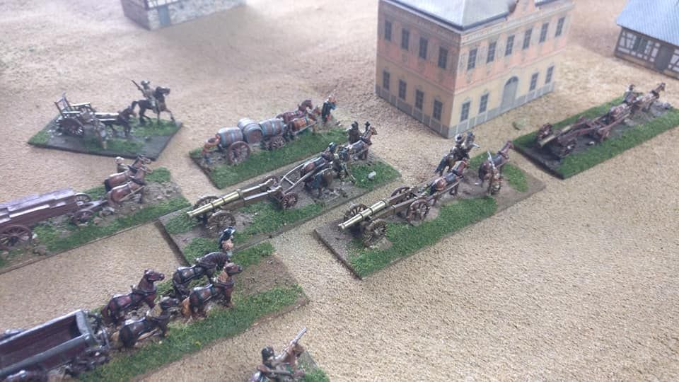 Devant l’armée : 24 canons moyens et lourds (9 canons de 24 livres, 2 de 16 livres, 6 de 12 livres, un de 10 livres, 6 de 6 livres) plus théoriquement 1 à 2 pièce légère par régiment d’infanterie).
