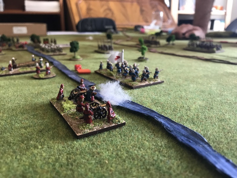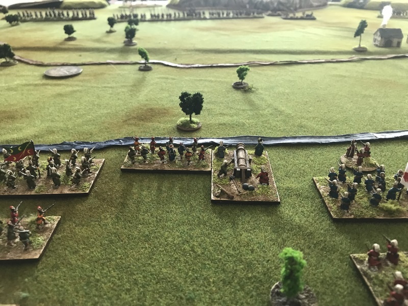 L’artillerie était distribuée sur le front de la première ligne : 26 pièces de gros canon devant l’infanterie, et 20 pièces de campagne devant chaque aile chargées à cartouche.