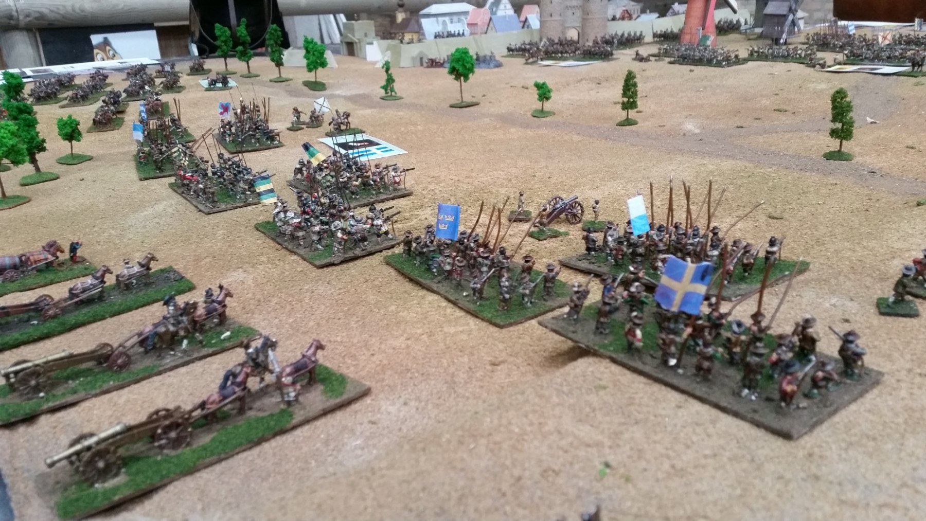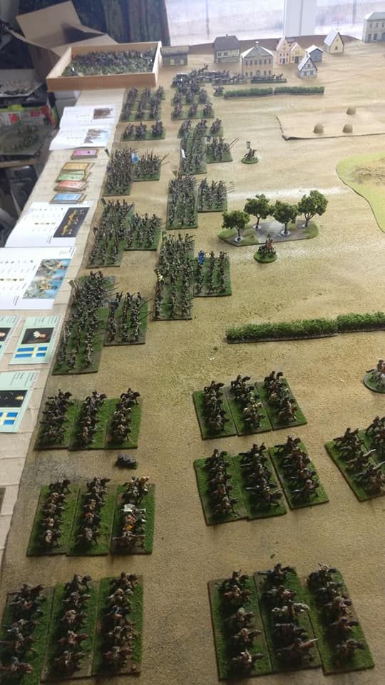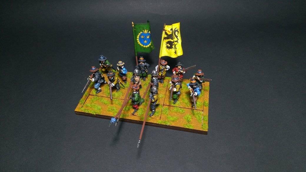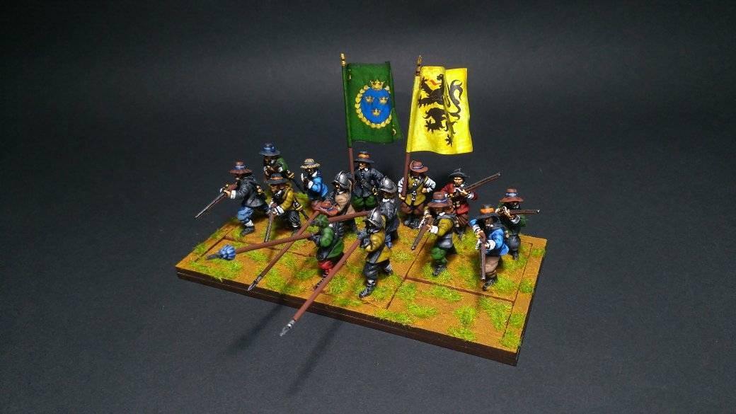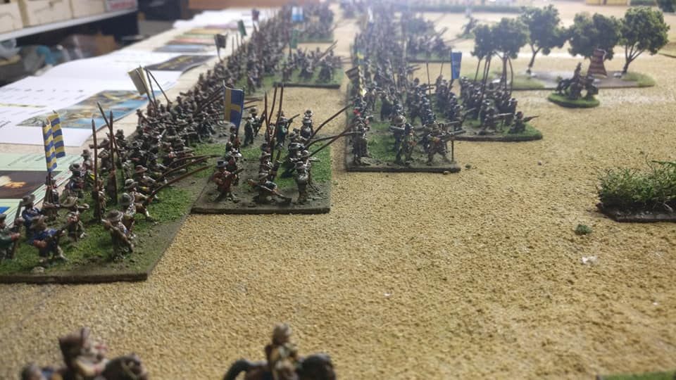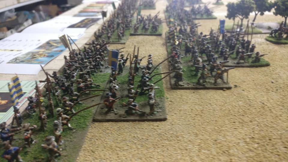 Pour LM Tercios, les brigades d’infanterie suédoise sont à 1 580 hommes et les escadrons de cavalerie à un peu moins de 250 chevaux. Les 8 brigades suédoises sont représentées chacune par un modern squadron reinforced, avec une stamina de 5 (et non 3 comme dans le livre de règles). Les brigades bleu suédoise et jaune étant veteran. Les 4 brigades de première ligne ont en plus la règle regimental gun. Les détachements de mousquetaires sont représentés par 4 compagnies (2 sur chaque aile) shot company musketeers brigade rule avec regimental gun. Les 25 escadrons de cavalerie (250 chevaux par escadron) sont cuirassiers modern cavalry, l’escadron de finnois (Stalhansk) étant en plus fearless. L’artillerie est représentée par 1 canon lourd et 2 canons moyens (les pièces légères étant intégrées dans les brigades d’infanterie).